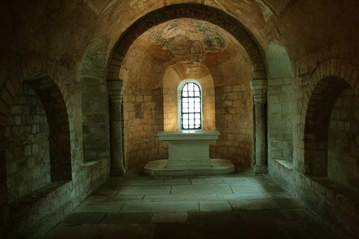Die bunten Lichtreflexe durch die Glasmalereien bieten bei gutem Licht einen besonderen Anblick im hellen Hauptgewölbe |