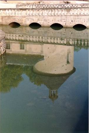 im "Kriegherrenzimmer" zeugen davon.Als ehemalige Festung ist das Château noch von einem Burggraben umgeben, wie das Bild auf der rechten, eine Spiegelung im Wasser, zeigt. Wenig empfehlenswert scheint die Auberge gegenüber dem Eingang zum Château. Unsere belegten Baguettes gaben zwar keinen Anlaß zur Klage. Neben uns hatten sich aber zwei Französinnen zum Mittagsmenu entschlossen, ihre Kommentare über das Essen bis hin zum Kaffee unterhielten uns eine ganze Weile ausgezeichnet. Etwas konnten wir dann noch aus eigener Ansicht leicht bemängeln: Wir hatten draußen gesessen, bevor wir dann das Schloß besichtigten. Als wir nach gut einer Stunde wieder vorbeikamen, stand der Käse der beiden unzufriedenen Damen, die längst gegangen waren, tatsächlich immer noch in der prallen Sonne.  |