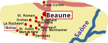 Leider sind noch nicht alle auf der Karte angeführten Orte anklickbar - es fehlen noch St. Aubin und Monthelie. Die nähere Umgebung von Beaune wird eindeutig vom Weinanbau bestimmt. Nach Westen fallen die Montagne zum Tal der Saône hin ab, in diesem flacher werdenden Bereich wachsen die meisten Weine mit den berühmten Namen: Meursault, Montrachet, Volnay, Pommard, Aloxe-Corton und viele mehr.Zum Osten hin steigen die Berge an, in vielen Quertälern kann man unter steil abfallenden Felswänden angeklebte Dörfer finden. Ein solches ist auch Orches , ein zweihundert Einwohner Nest ohne Laden oder Telefonzelle - unser Lieblingswohnort in Burgund. Für Weingenießer - nach Möglichkeit allerdings recht vermögende - ist diese Gegend sowieso ein Paradies. Aber auch für den weniger Wein-fixierten Urlauber ist hier gesorgt, bei Fahrten durch die Haute Côte de Beaune findet er herrliche Ausblicke und wunderschöne kleine Weindörfer.