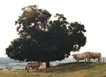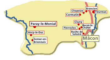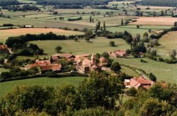 Ebenso hügelig wie Charollais und Brionnais präsentiert sich auch das nördliche Mâconnais. Häufiger ziehen sich aber kleine Waldstücke besonders über die Gipfel der Hügel. Das Klima ist sehr mild, man merkt, daß man sich immer mehr dem Süden annähert, manchmal merkt man dies sogar auch schon an der Architektur der Häuser. Wein wächst hier auch wieder und stellenweise - wenn auch in kleinen Gemarkungen - absolut hervorragender. Besonders hervorzuheben sind die Weißweine von Pouilly-Fuissé und der umgebenden Dörfer. Tournus mit seiner schönen Lage an der Sâone und der Abteikirche St. Philibert - einem Glanzstück der romanischen Architektur Burgunds - ist das Zentrum dieser Gegend. Auch hier ist die Landschaft eine der schönsten der Welt, das Bild links - ein Ausblick auf La Chapelle-sous-Brancion vom Plateau von Brancion - kann dies aufgrund der allgemeinen Mängel der Photographie und auch wegen seiner Größe nur dürftig wiedergeben, die Größe läßt sich mit einem Klick auf das Bild beheben. | |
