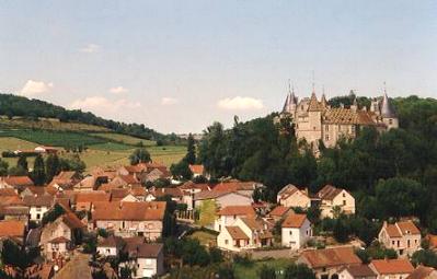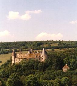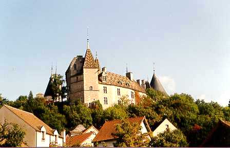 Schlosses wieder aufgebaut wurde.Über dem gleichnamigen Dorf erhebt es sich auf einem Berg, trutzig, wie es sich angesichts der alten Aufgabe als Wehrburg geziemt, und gleichzeitig auch - den Interessen der neuen Erbauer gemäß - elegant und spielerisch mit der Farbenpracht der in der ganzen Gegend augenfälligen glasierten Ziegel. Ein Blick in den Innenhof und die alte Kapelle, die erhalten blieb, sind den Eintrittspreis wert, was man von der obligatorischen Führung nur teilweise sagen kann. Das Interieur besteht wie meist in diesen Fällen aus einem Sammelsurium mittelalter und nicht ganz so alter Gegenstände meist aus Burgund. Wer schon eingerichtete Burgen gesehen hat, könnte sich die Führung sparen, den Eintrittspreis muß man allerdings eh schon am Tor entrichten. |
